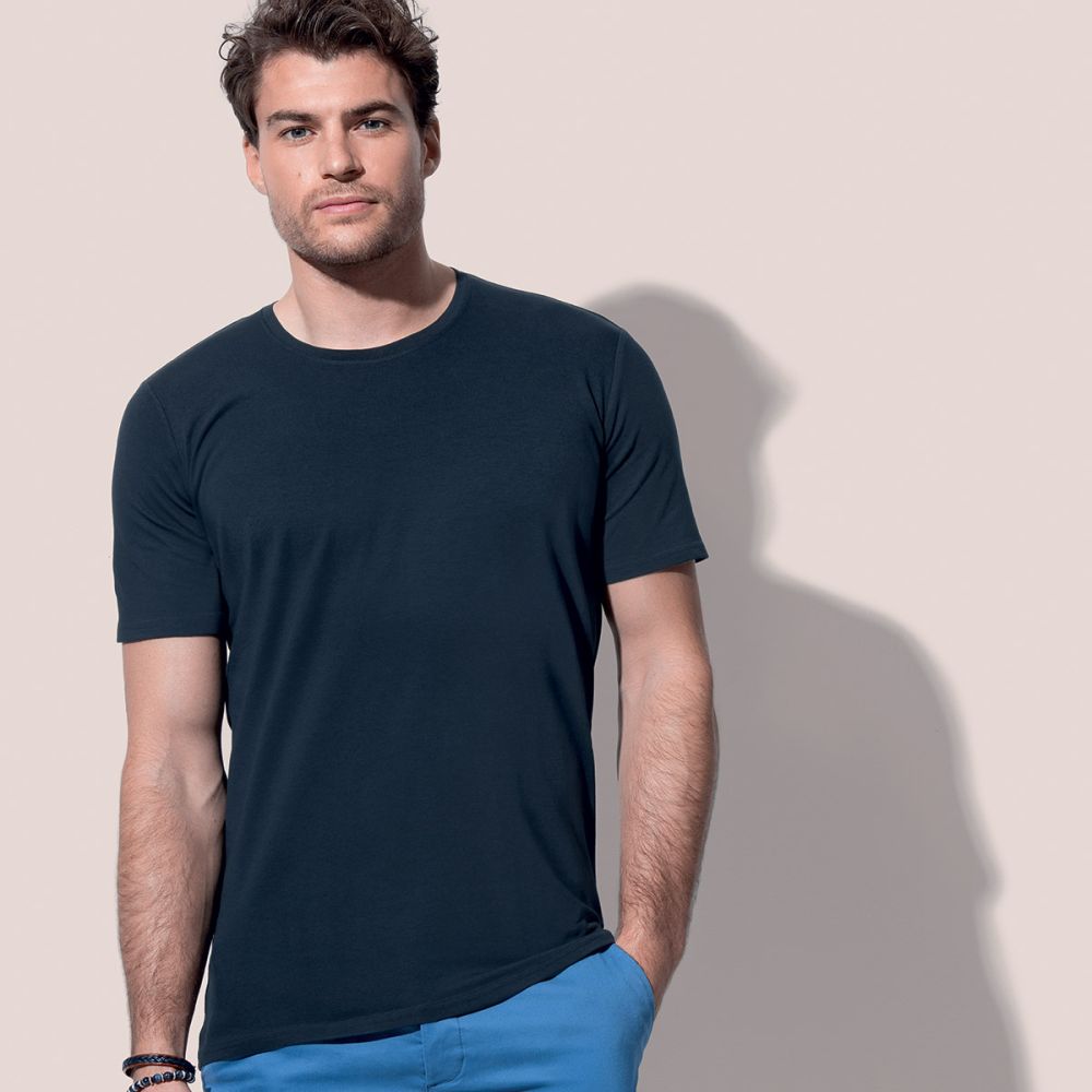 95% cotone ring-spun pettinato single jersey, 5% elastane. T-shirt manica corta, girocollo in costina, parasudore in contrasto, cuciture laterali, etichetta strappabile, lavabile a 40°. Col. GYH: 82% cot. 14% visc. 4% elas.