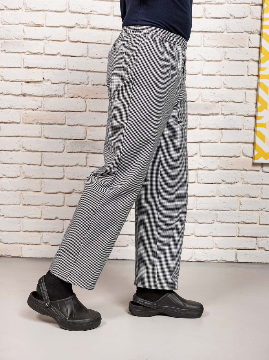 65% poliestere / 35% cotone con lavorazione a quadratini. Vita elasticizzata. Tasca dietro. Lavaggio industriale a 85 °C. Modello misto.